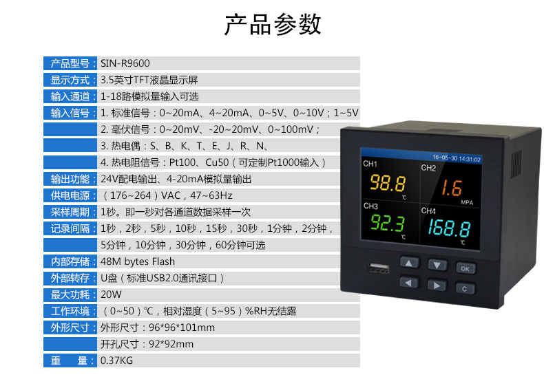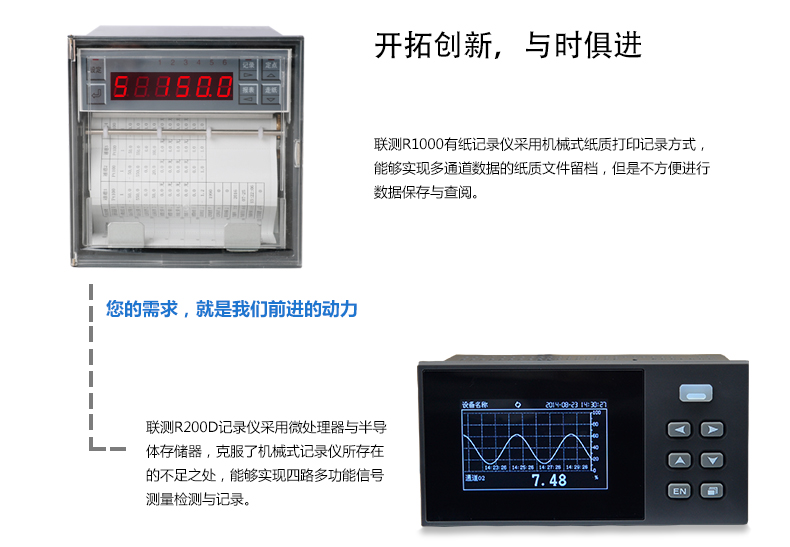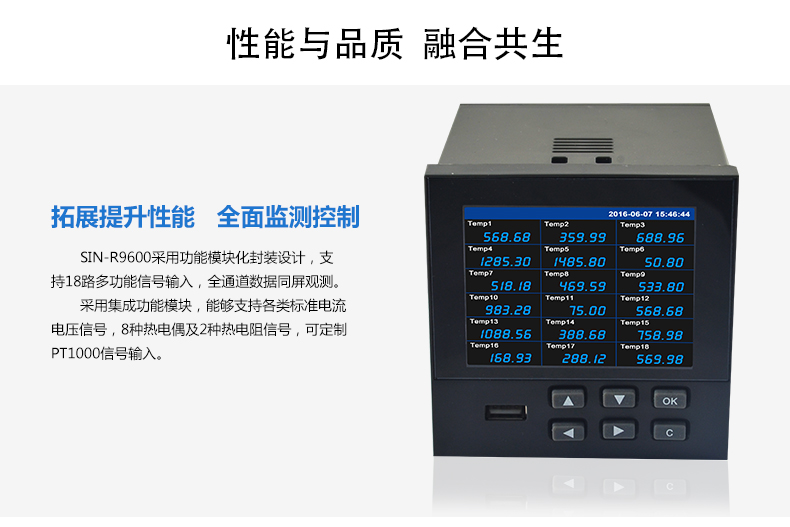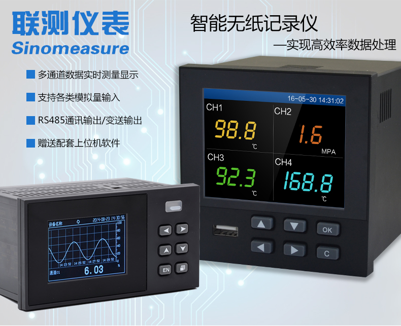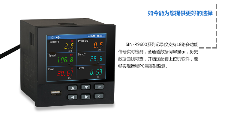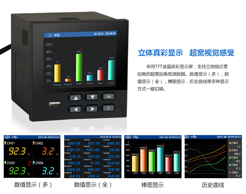 無紙記錄儀是將采集的數據/運算數據以時間為基軸記錄在儀器內部的存儲系統中,無消耗任何常用的記錄設施,如:紙張、筆墨。記錄在儀器內部的存儲數據,通過運算、模擬后顯示在液晶屏。常用顯示用液晶屏比較廣泛。在液晶屏屏幕上,可以顯示數字顯示、棒圖顯示、曲線顯示、報警列表等。無紙記錄儀采集的數據,常用的有:溫度、壓力、流量、液位、電壓、電流、濕度、頻率、振動、轉速等。