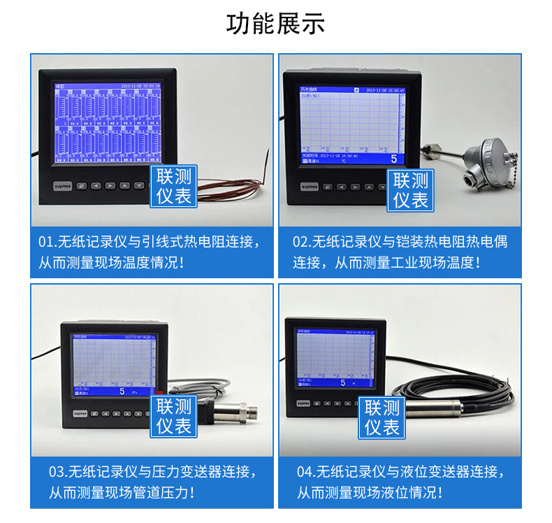 無紙記錄儀是將采集的數據/運算數據以時間為基軸記錄在儀器內部的存儲系統中,無消耗任何常用的記錄設施,如:紙張、筆墨。記錄在儀器內部的存儲數據,通過運算、模擬后顯示在液晶屏。常用顯示用液晶屏比較廣泛。在液晶屏屏幕上,可以顯示數字顯示、棒圖顯示、曲線顯示、報警列表等。無紙記錄儀采集的數據,常用的有:溫度、壓力、流量、液位、電壓、電流、濕度、頻率、振動、轉速等。
