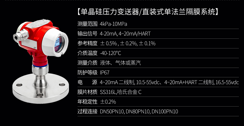 單晶硅壓力變送器用于測量液體、氣體或蒸汽的液位、密度、壓力,然后將其轉變成4-20mAHART電流信號輸出
